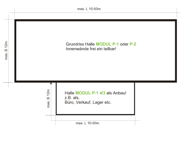 Mit der Modul-Halle ist alles möglich: kombinieren und erweitern Sie nach Ihrem Bedarf. Gestalten Sie Ihren Gewerbebau nach Ihren Vorstellungen. Grundriss, Verglasung, Fenster, Türen, Toren etc.